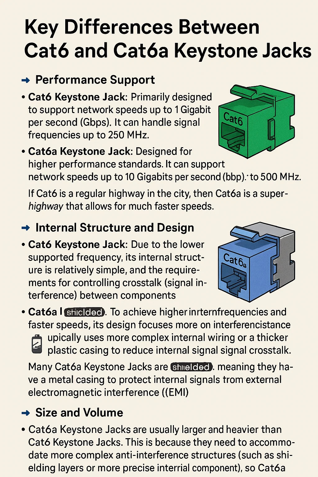 • Cat6a Keystone Jacks er normalt **større og tungere** end Cat6 Keystone Jacks.