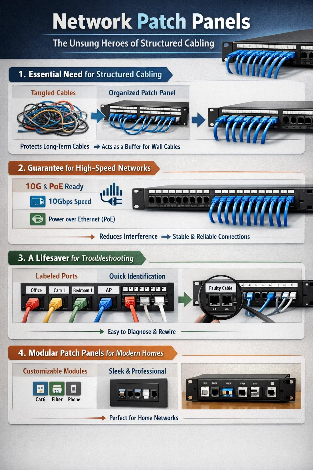 Fysisk lagbeskyttelse: Netværkskablerne inde i væggene er normalt stive. Hvis de sættes direkte i en kontakt, kan hyppig tilslutning og frakobling og bevægelse få ledningskernerne til at knække. Patch-panelet fungerer som en buffer; den forbliver stationær, og du flytter kun de korte patchkabler på ydersiden, hvilket beskytter de dyre lange kabler inde i væggen.