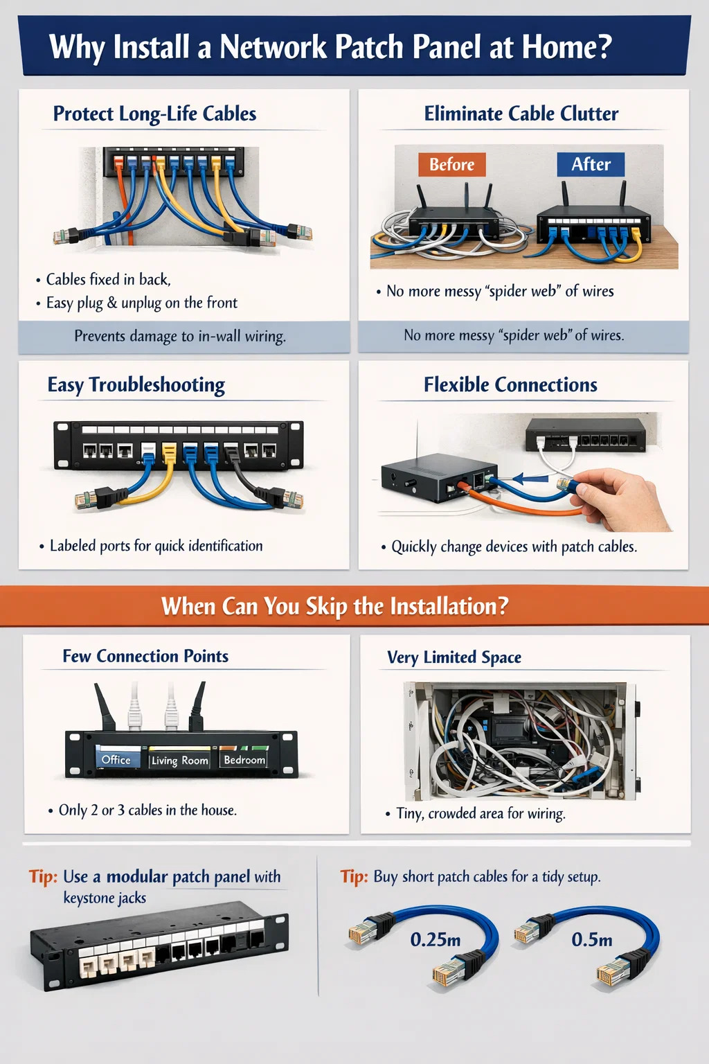 Nogle ældre huse har meget små lavspændingsbokse, der simpelthen ikke kan rumme et standardnetværkspatchpanel. I dette tilfælde vil tvinge installationen kun gøre interiøret mere overfyldt.